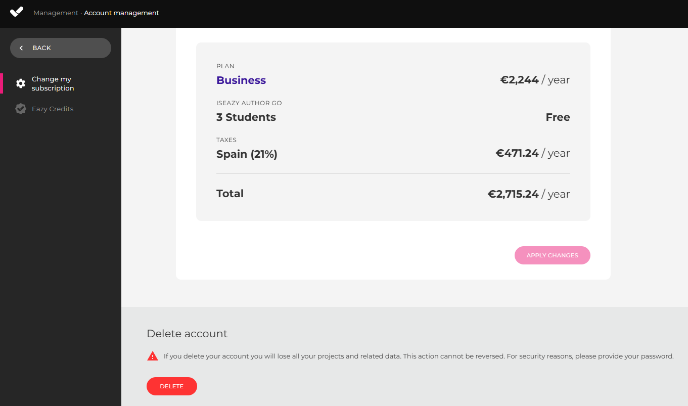 If you have your personalised isEazy Author Go platform, your published courses and the tracking metrics generated by your students will also be deleted there. They will no longer be able to access them once you cancel your account.