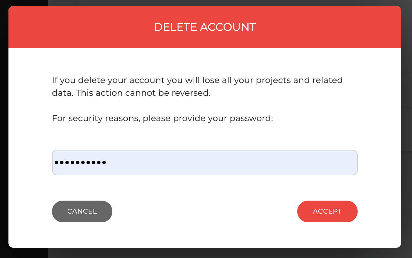 Please note that when you delete an account, you will lose all the projects and associated data as we cannot keep them due to the LGPD (General Data Protection Act).