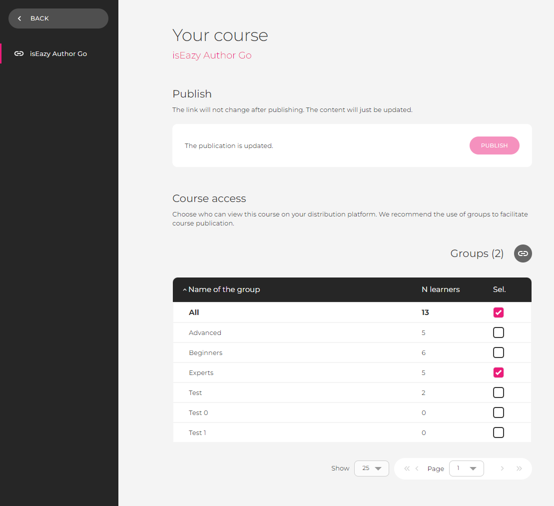 If you have made any changes to the courses that you have created since your last publication, you can update the published course or courses. Just click on ‘Publish’ and the updated version will automatically replace the previous version on the platform.