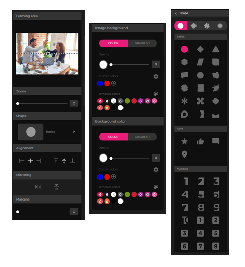 - Mask: In this mode, the image will be clipped to the selected shape and will fill the entire space within it. You can choose the focal point, zoom level, shape in the mask settings, alignment, mirroring, solid or gradient background color, and inner margins.