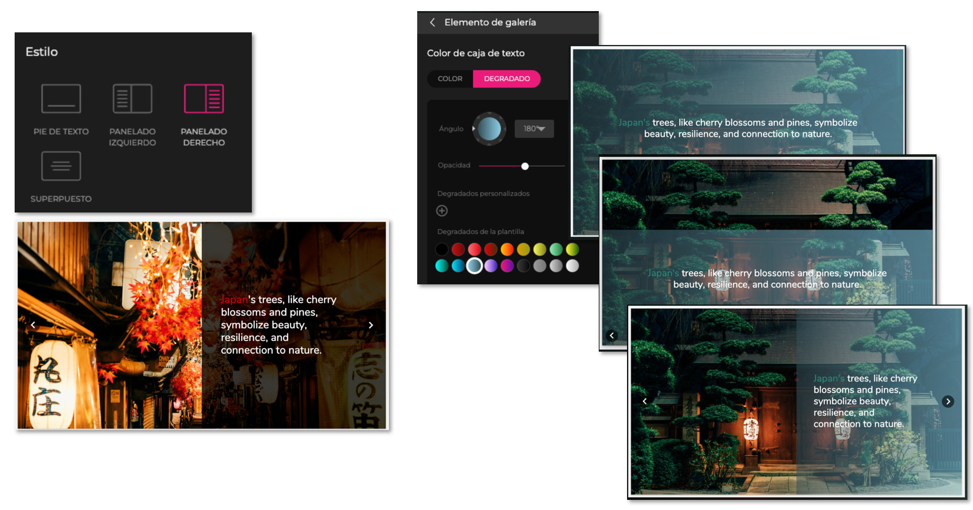 Ya puedes probar las dos nuevas funcionalidades del elemento Galería. Con el nuevo estilo panelado derecho, puedes aportar aún más protagonismo a tus imágenes. Y utilizando fondos degradados para las cajas de texto de cada elemento de la galería, haces que tus cursos luzcan más atractivos visualmente.