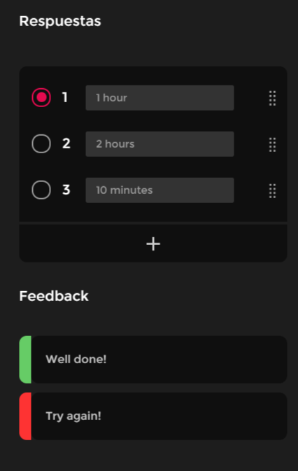 Para cada uma dessas interações, você também poderá configurar uma imagem, um conteúdo de texto e, no caso da pergunta ABC, as respostas e um feedback de acordo com a resposta.