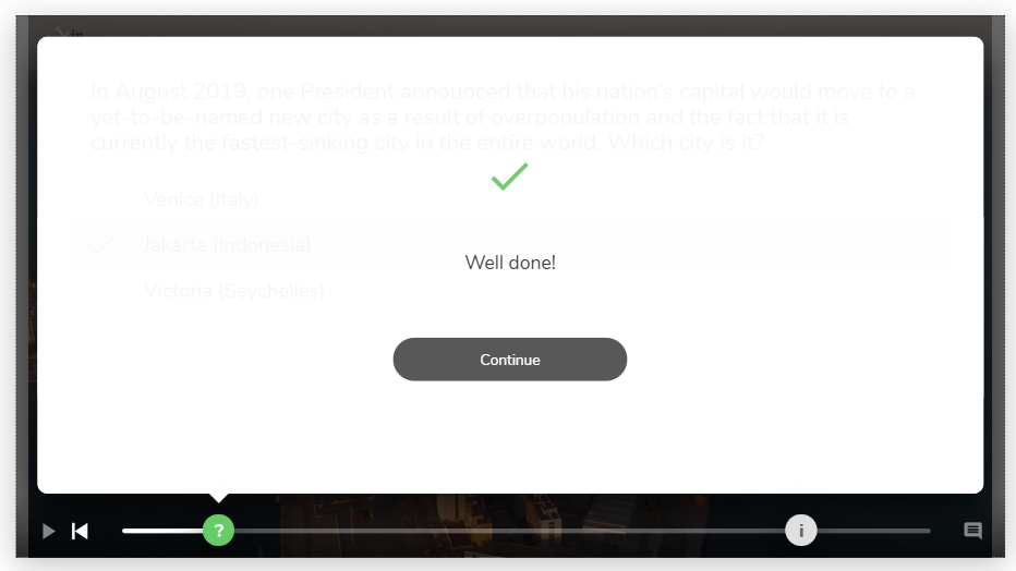 No caso do ABC, as perguntas respondidas recebem feedback imediato, sejam corretas ou incorretas. Assim, uma vez que essa interação tenha sido concluída, seu indicador na barra de reprodução do vídeo aparecerá em verde se tiver sido respondida corretamente na primeira tentativa, ou em vermelho, caso contrário.