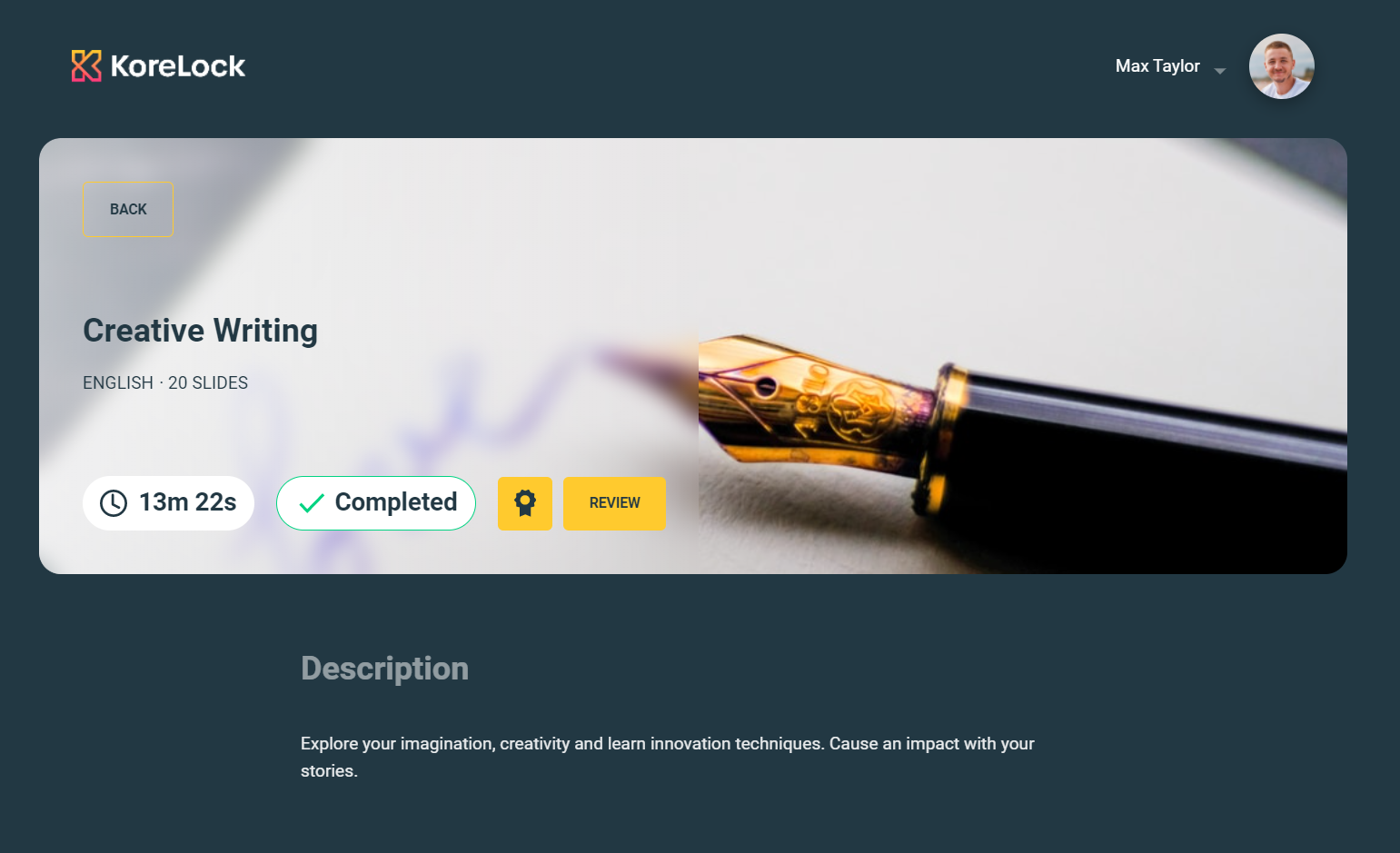 - Resume/Review: leva você a retomar a realização do curso ou, após a conclusão, a revisá-lo