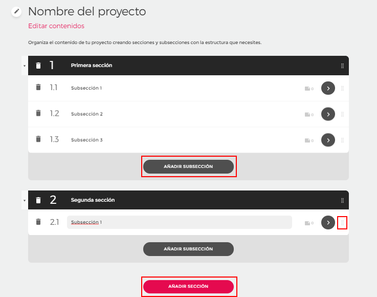 Ao criar um novo projeto, o sistema adiciona automaticamente uma seção e uma subseção para que você possa começar a trabalhar imediatamente. A estrutura do curso pode ser modificada e ampliada na aba Editar conteúdos, localizada no menu do projeto.