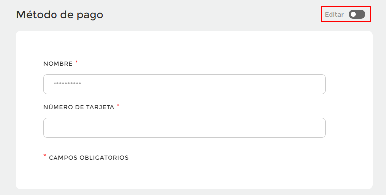 Para editar os dados de faturamento ou o método de pagamento, basta habilitar a edição clicando no botão Editar, localizado no canto superior direito do bloco. Isso permitirá a escrita nos campos.