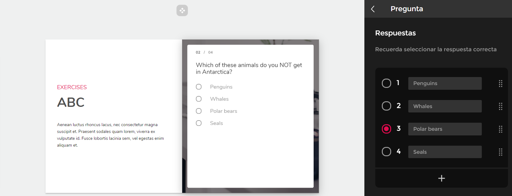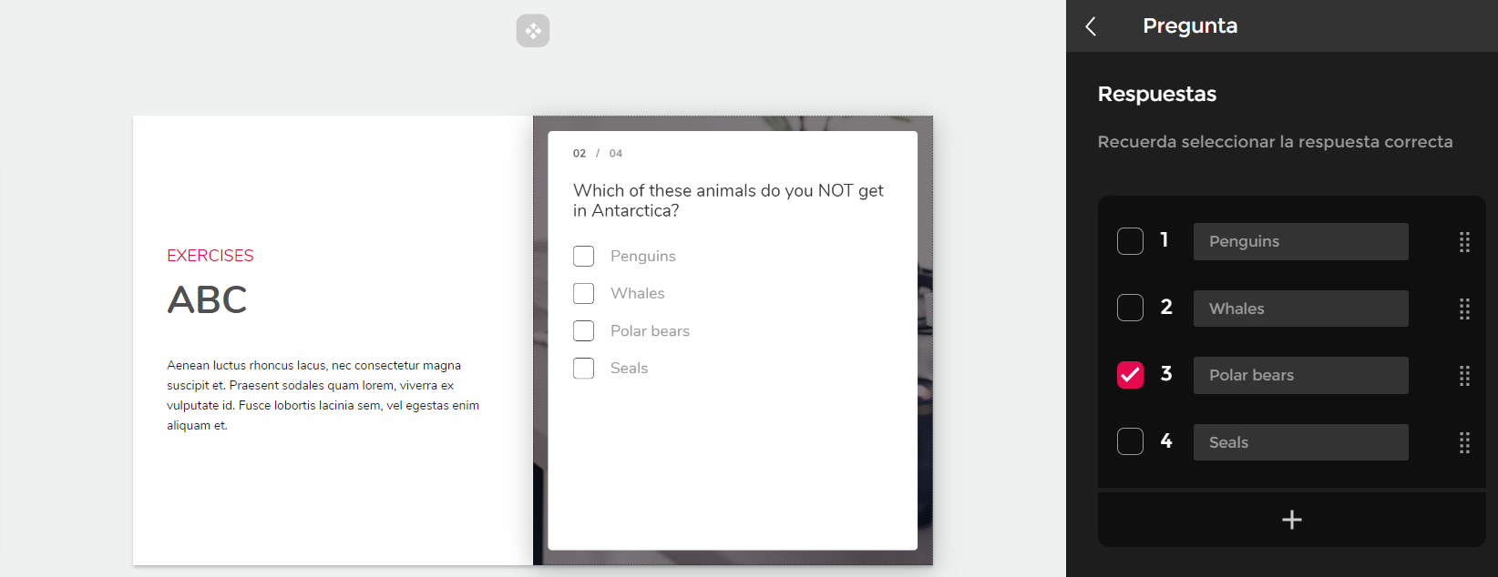 Você pode adicionar um título ou texto introdutório que será exibido na capa do exercício. Note que, se o exercício estiver colocado em um espaço muito pequeno do slide, este texto não será exibido.