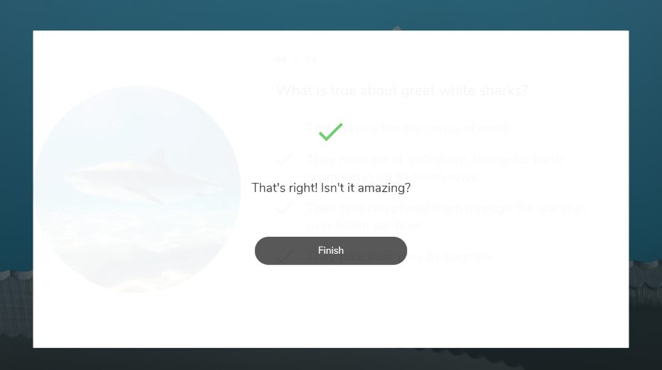 Na última pergunta, quando todas as respostas estiverem corretas, aparecerá o botão “Finalizar”: