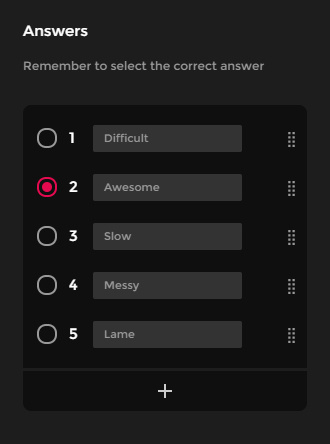 Crie tantas respostas quanto desejar clicando no botão + que se encontra ao final da lista. Você pode editar o texto da resposta diretamente no item da lista.