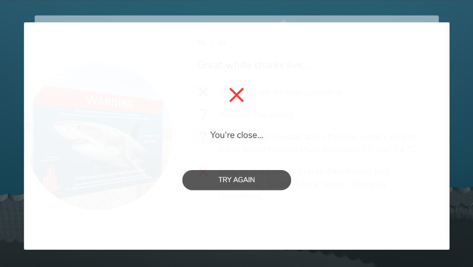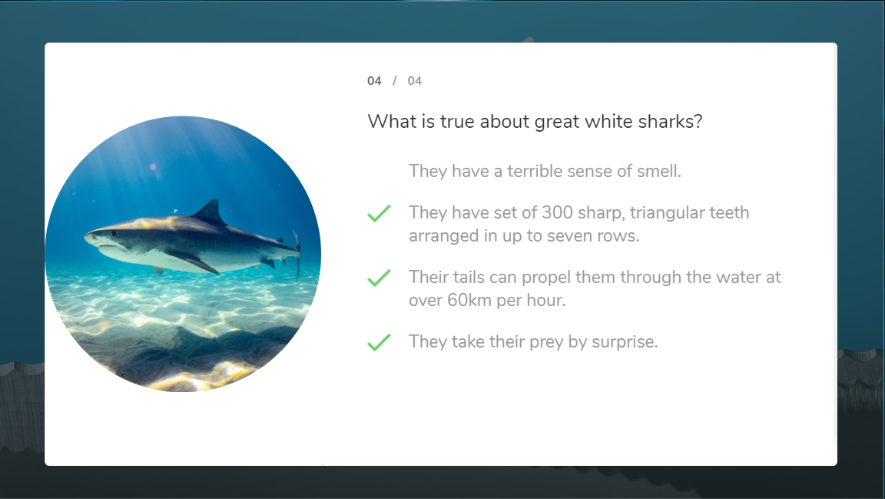 Se você tiver escolhido o Modo de resposta MÚLTIPLA, em cada pergunta o aluno verá se a resposta selecionada está correta ou não. Em caso de erro, aparecerá um X, e as respostas que não tiver selecionado aparecerão com um ponto de interrogação, como na imagem: