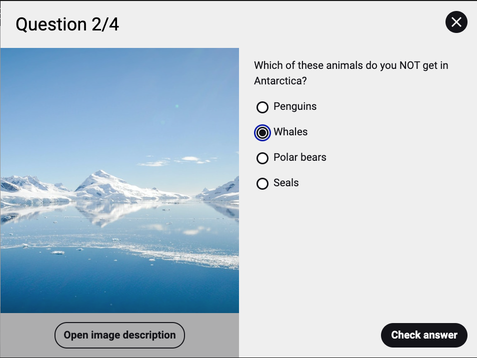 - Adicione texto alternativo e descrição longa para as imagens que acompanham cada pergunta, quando necessário.