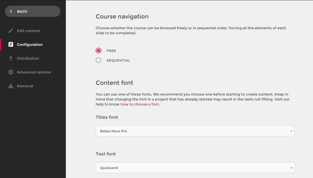 Nos cursos Express não é possível modificar o tipo de navegação. Isso acontece porque o curso Express é pensado para ser um conteúdo ágil e de consumo rápido, e a navegação sequencial não é adequada para esse formato. Por isso, em cursos Express sempre será definido o tipo de navegação livre vertical.