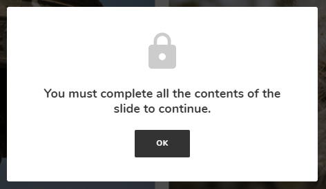 Se o aluno tentar acessar conteúdo bloqueado clicando no botão Continuar, pelo índice ou por meio de uma URL, aparecerá uma janela modal explicando o que ele deve fazer para prosseguir.