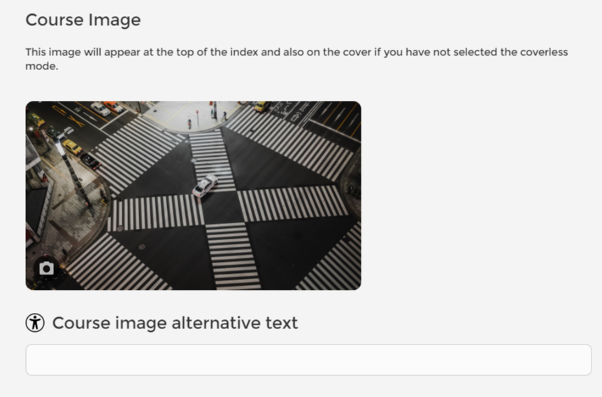 No modo Acessível, você tem a opção de adicionar textos alternativos (ALT Text) e descrições longas para todas as imagens, inclusive para a imagem do curso.