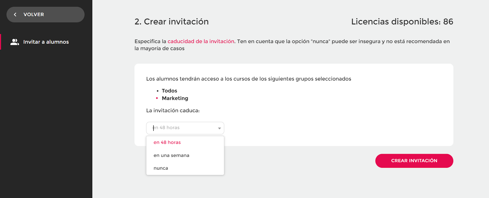 Depois de selecionar os grupos nos quais os alunos que se autorregistrarem ficarão atribuídos, você também pode definir a validade do link. As opções disponíveis são: 48 horas, uma semana ou sem validade.
