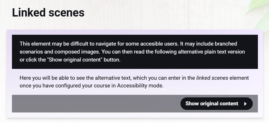 Por isso, quando um usuário acessar o curso em Modo Acessível, poderá escolher entre ler uma descrição alternativa ou consumir o conteúdo original não acessível:
