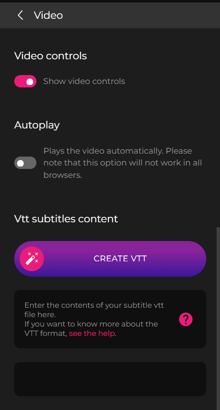 Dentro da configuração do elemento Vídeo, ao clicar no botão “Criar VTT”, a IA gerará o conteúdo VTT automaticamente.