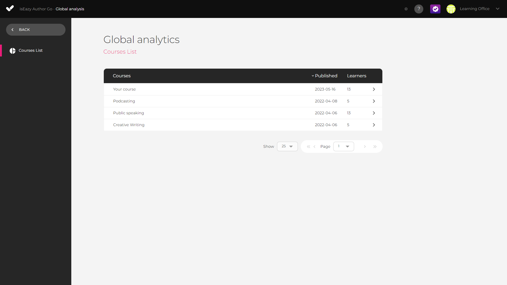 Na área de gestão do isEazy Author Go, você terá acesso à Análise Global, onde encontrará a lista de cursos que distribuiu com o isEazy Author Go, junto com a data de publicação e o número de alunos matriculados.