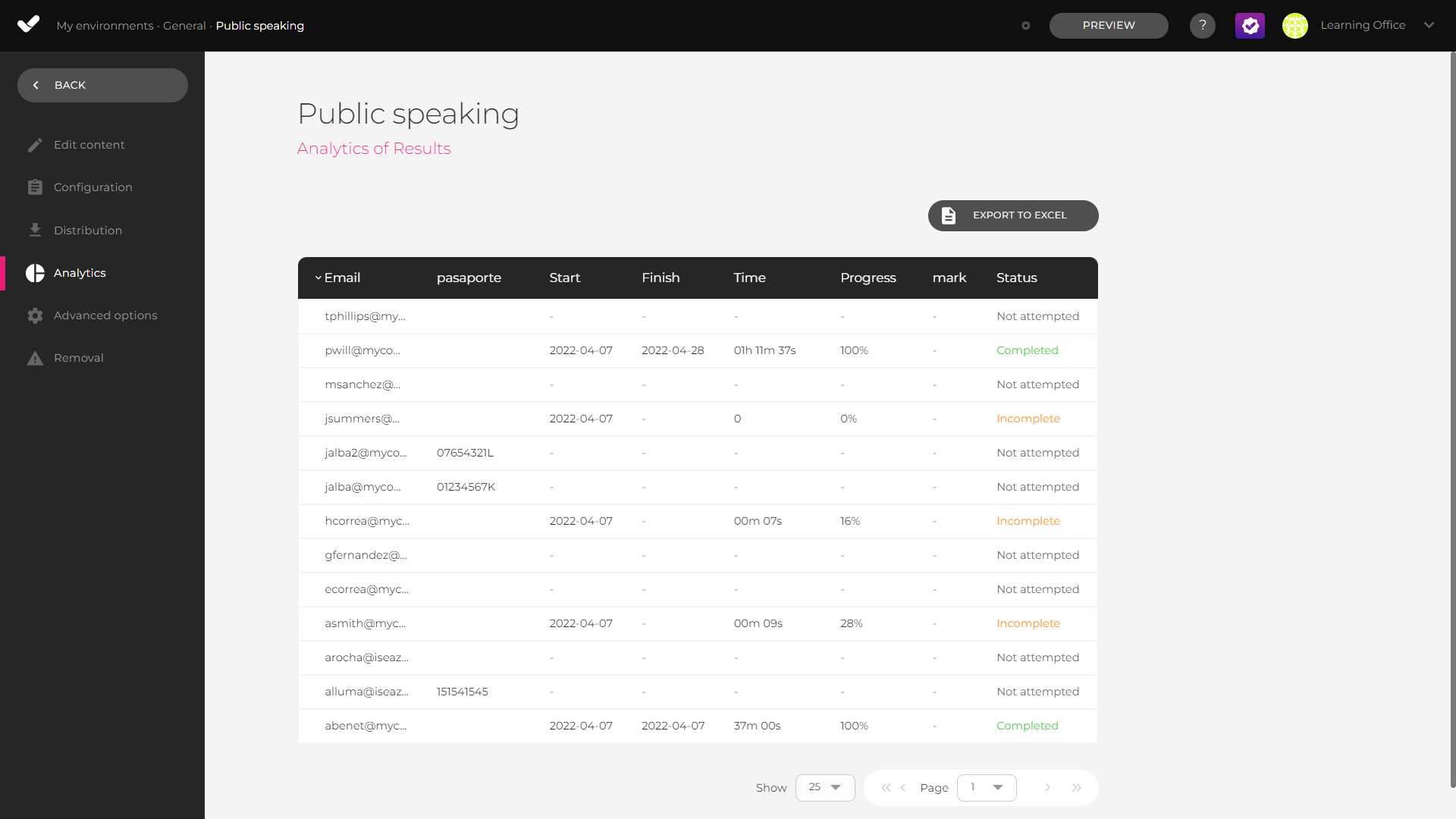 Você pode clicar no curso que desejar para consultar as seguintes informações dos seus alunos: data de início, data de término, tempo dedicado, porcentagem de progresso, nota, status e também o Perfil do estudante, caso tenha sido ativado e definido.