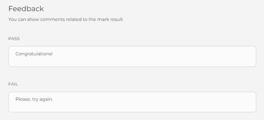 Com relação ao feedback geral da avaliação, você pode incluir uma mensagem no caso de a avaliação ser aprovada e outra para quando não for superada. Tenha em conta que uma avaliação com tentativas ilimitadas não mostrará o feedback por pergunta até a tentativa final na qual o usuário for aprovado.
