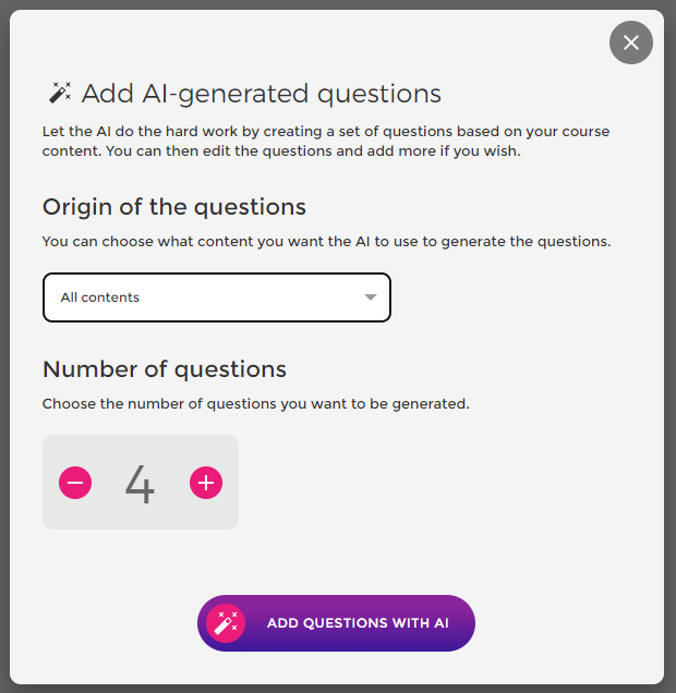 Ao clicar no botão “Adicionar perguntas com IA”, aparecerá uma janela com estas opções:
