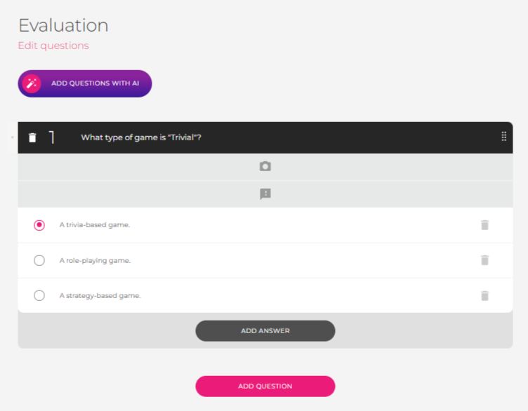 Clique no botão “Adicionar perguntas com IA” e pronto! A Avaliação do seu curso estará criada.