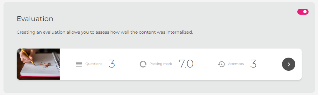 Ao ativar a Avaliação, você verá uma ficha com os dados mais relevantes sobre o seu conteúdo avaliativo. Para editá-la, clique na seta que se encontra à direita dessa ficha.