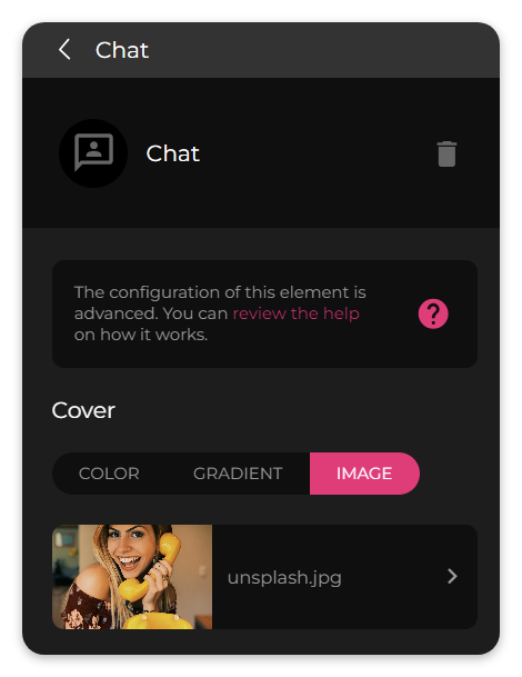 Imagem: se optar por usar uma imagem como fundo da capa, terá as mesmas opções de configuração que no elemento imagem. Consulte o artigo relacionado para mais informações.