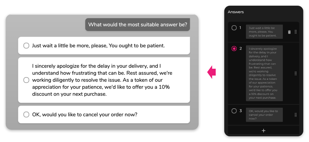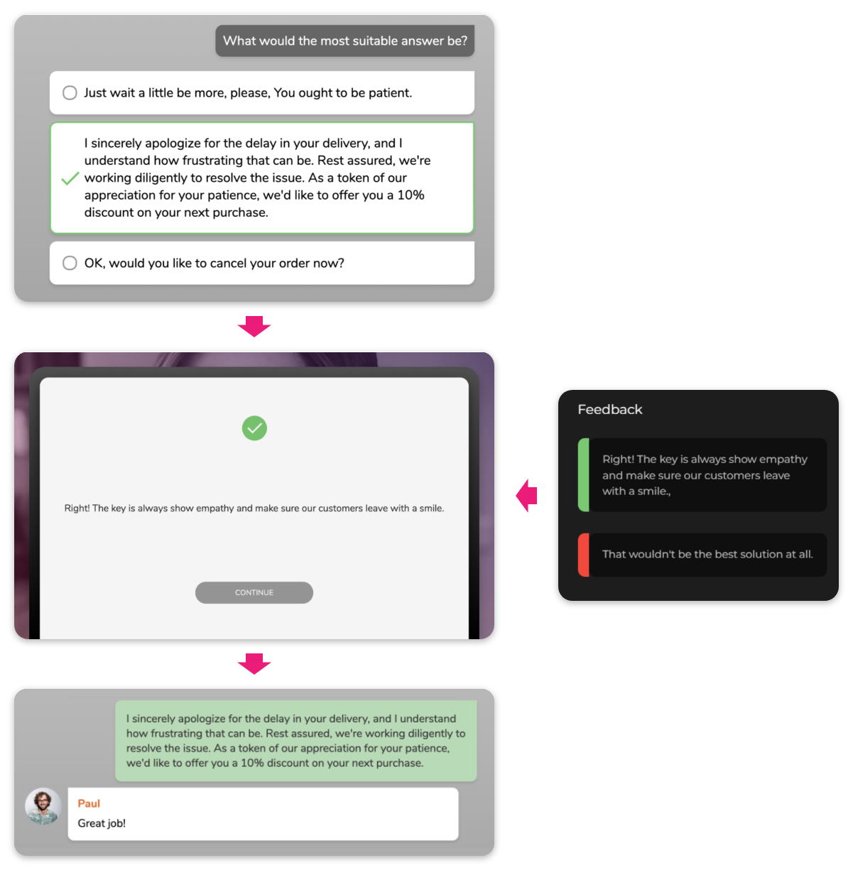 - ABC: possíveis respostas com feedback imediato. A cada resposta dada, o participante recebe feedback (seja correta ou incorreta). Para prosseguir na conversa, é necessário selecionar a resposta correta.