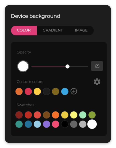 Cor: escolha uma cor da paleta e configure sua opacidade. Também é possível selecionar qualquer outra cor usando o configurador de cores personalizadas.