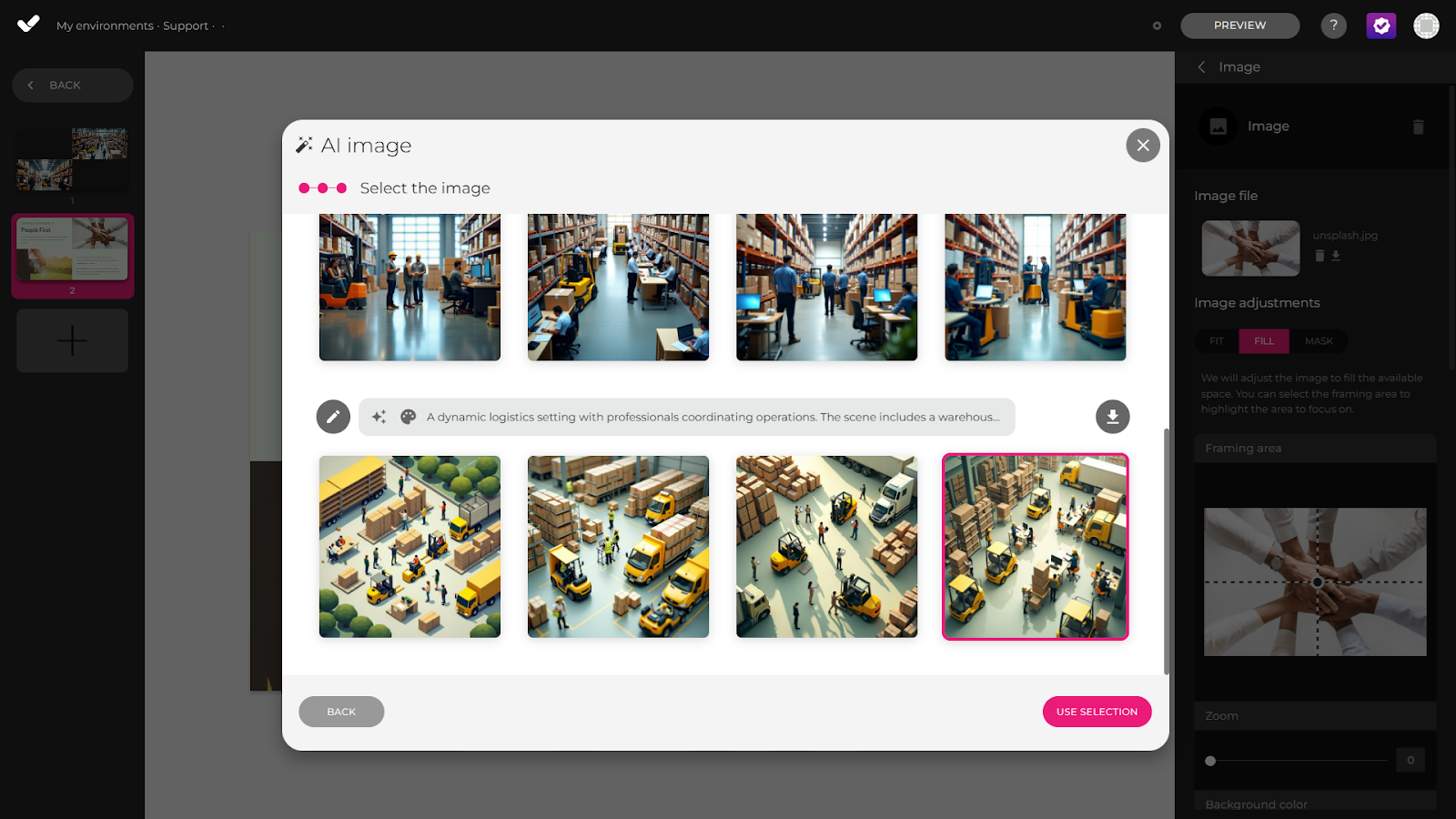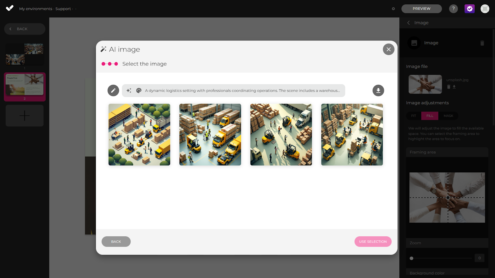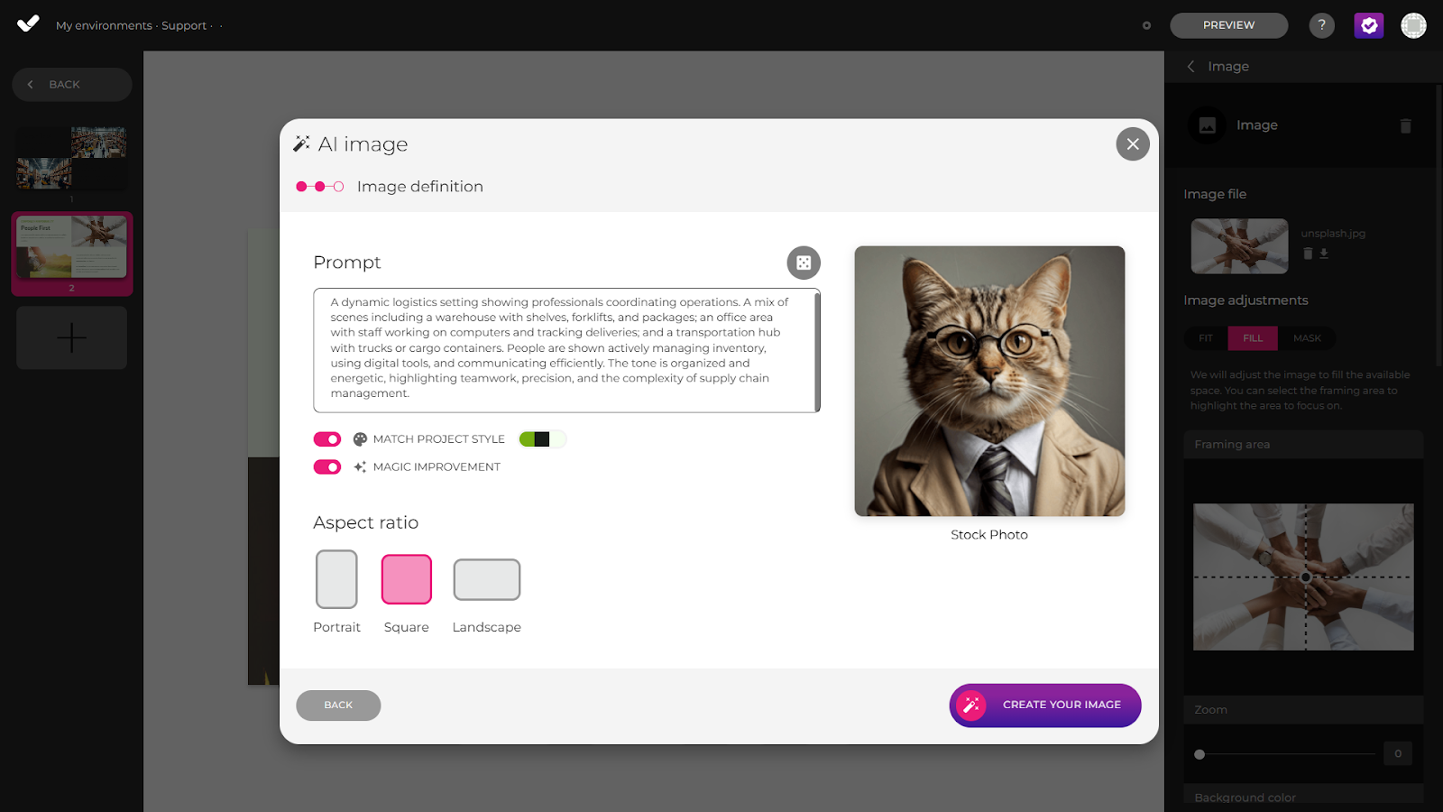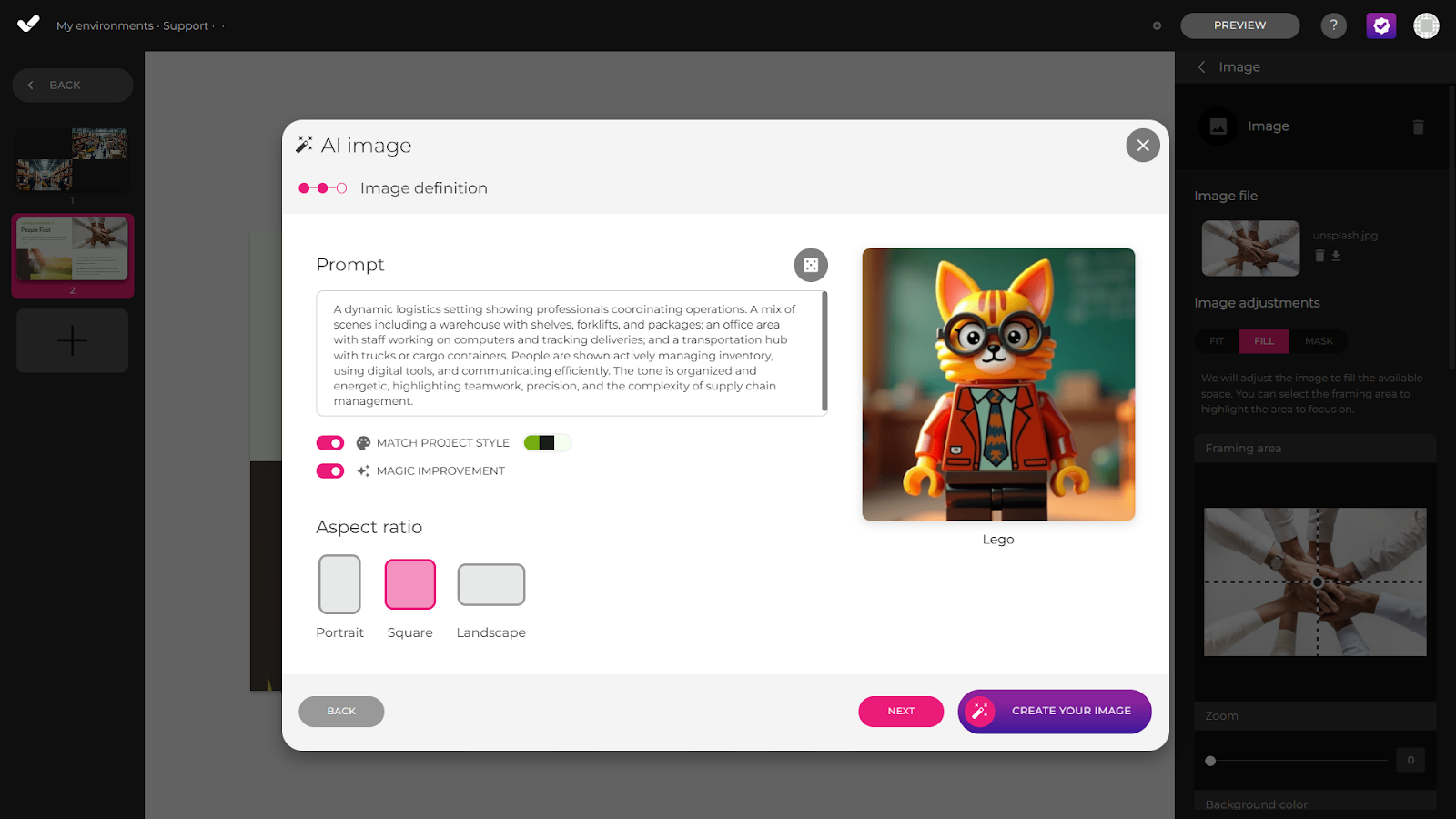 Além disso, você poderá definir que as imagens criadas automaticamente se adaptem à paleta de cores do seu projeto. Assim, as imagens geradas terão uma estética coerente, resultando em um material mais uniforme, atraente e profissional.