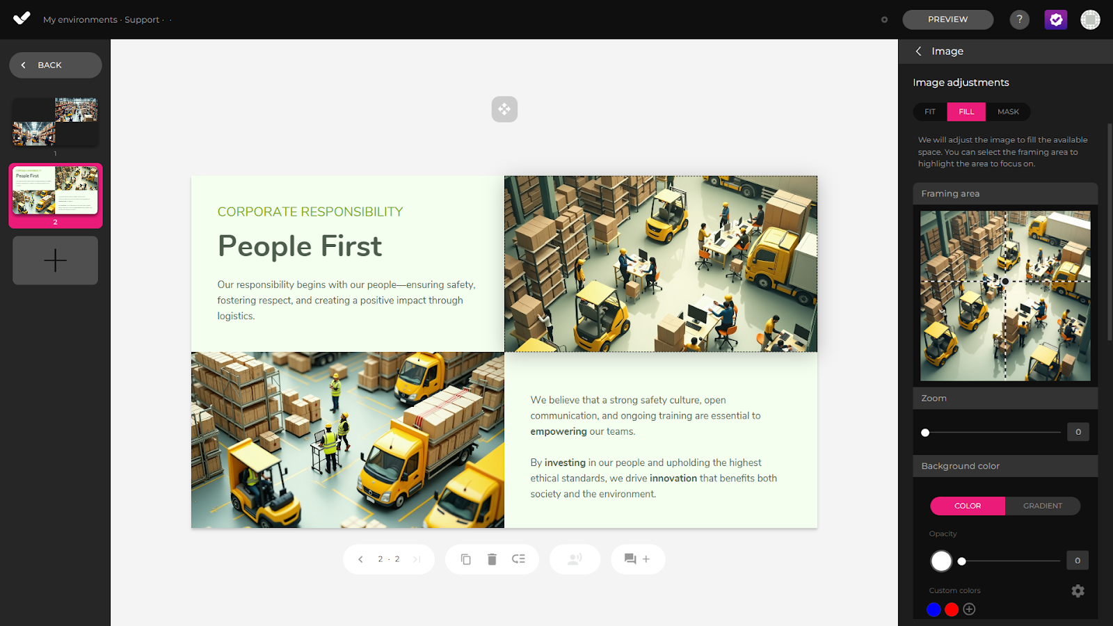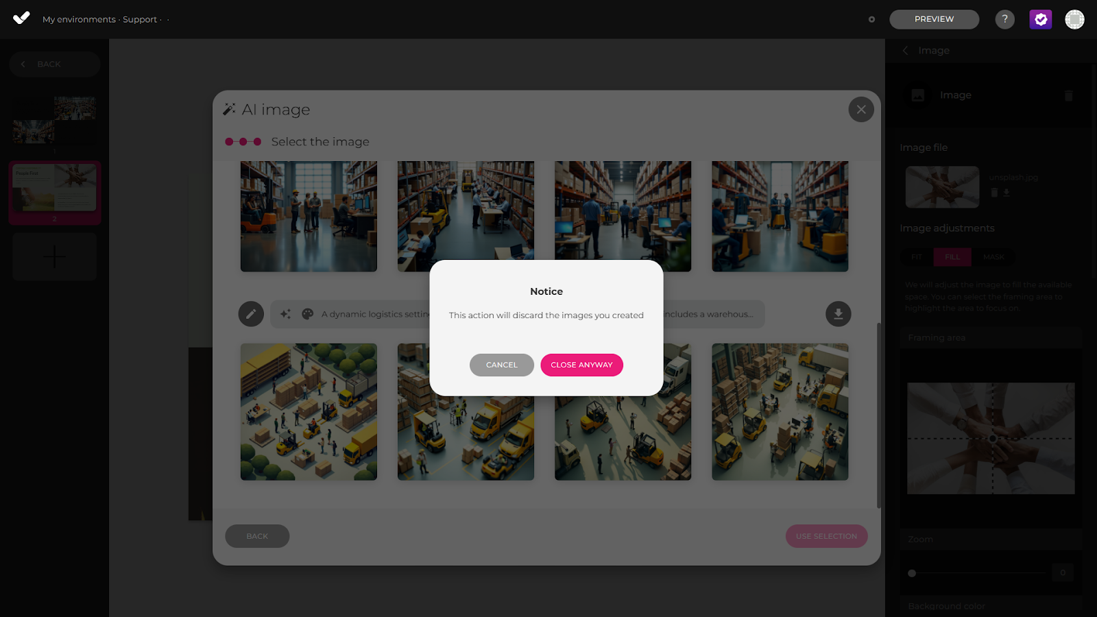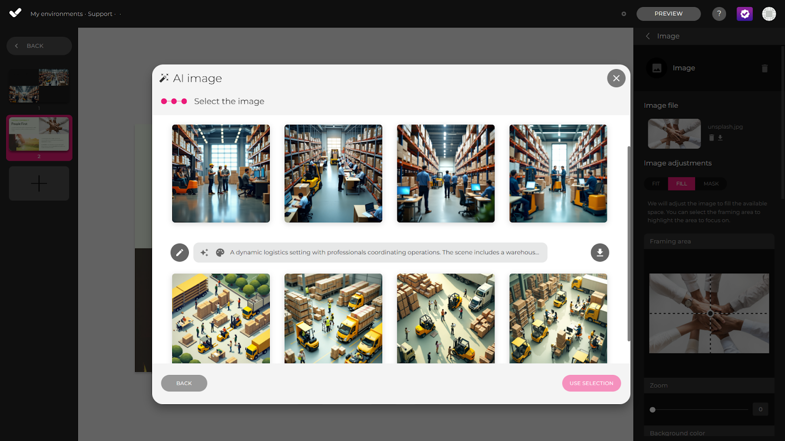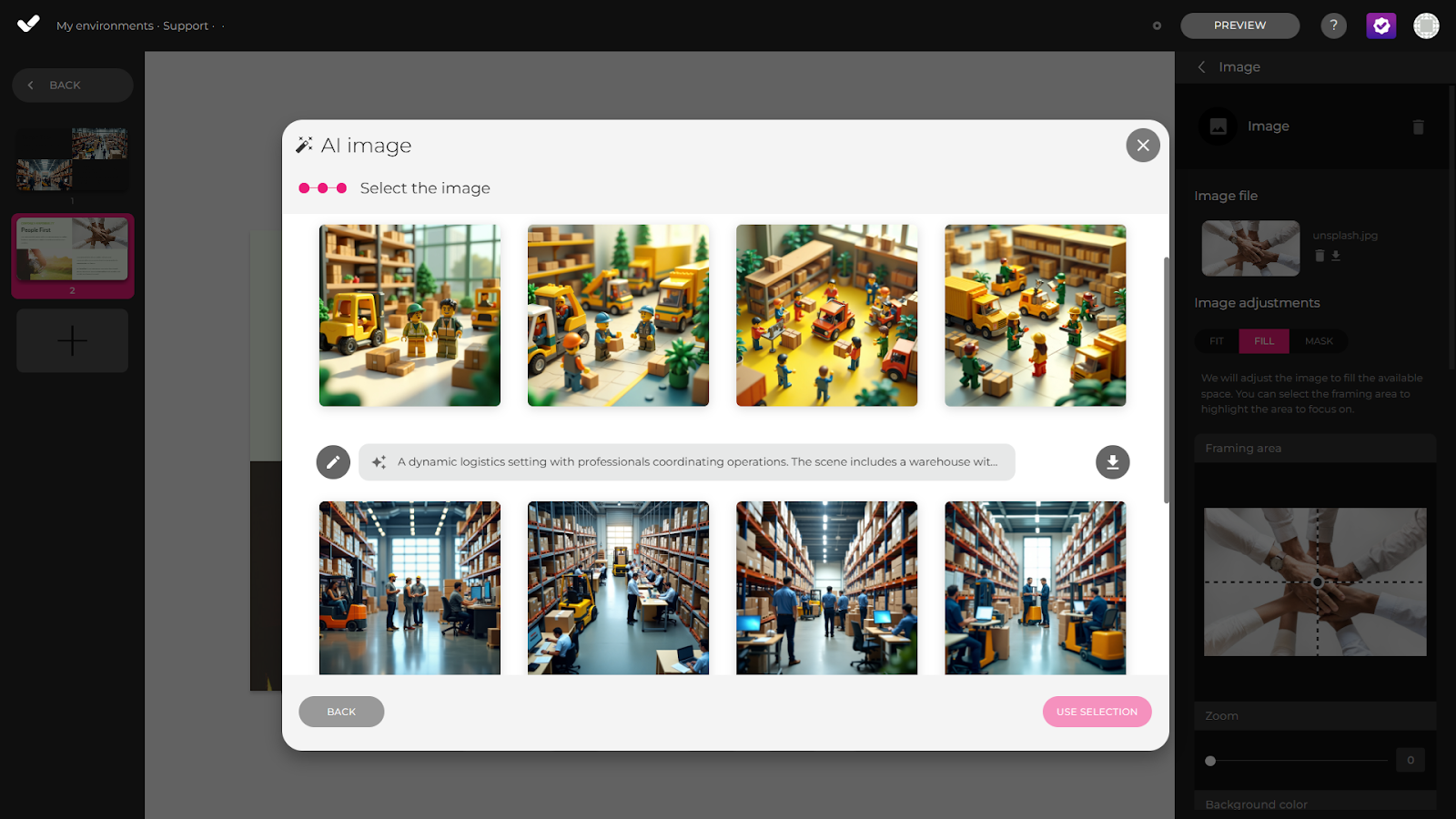 Além disso, você poderá definir que as imagens criadas automaticamente se adaptem à paleta de cores do seu projeto. Assim, as imagens geradas terão uma estética coerente, resultando em um material mais uniforme, atraente e profissional.