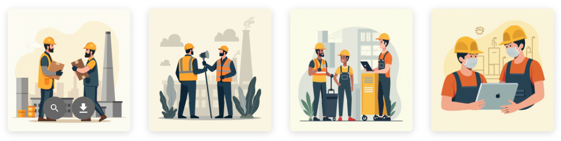 “Operators wearing hard hats and safety vests working together in a factory.” (Operários com capacetes e coletes de segurança trabalhando juntos em uma fábrica).