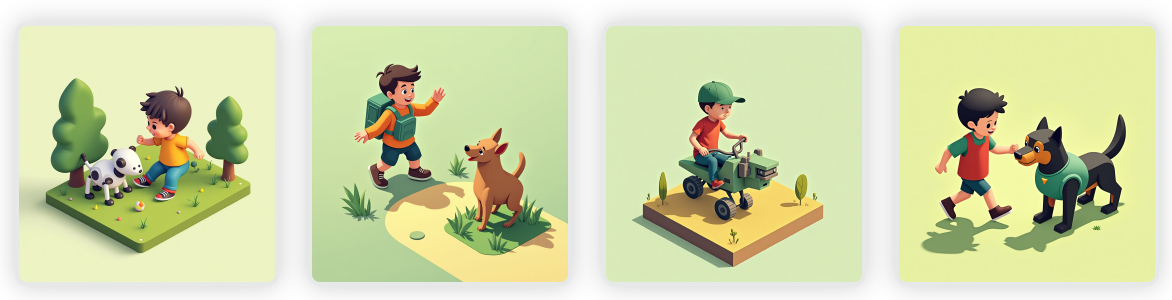 Exemplo: “A boy playing with a robot dog in a grass field.” (Um menino brincando com um cachorro robô em um campo de grama).