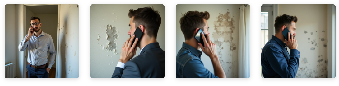 Exemplo: “A person looks worriedly at the damp and mould on the wall of his house while making a phone call.” (Uma pessoa olha preocupada para a umidade e o mofo na parede de sua casa enquanto faz uma ligação telefônica).