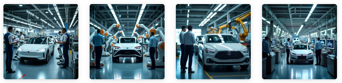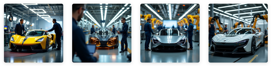 “Futuristic automotive factory in full production, with an automated assembly line manufacturing electric vehicles with aerodynamic design and shiny metallic finish. Yellow-black robotic arms assemble parts with precision, generating sparks as they weld. Engineers and technicians in corporate uniforms and safety glasses monitor the process on holographic screens, adjusting parameters and verifying quality in a high-tech industrial environment.”