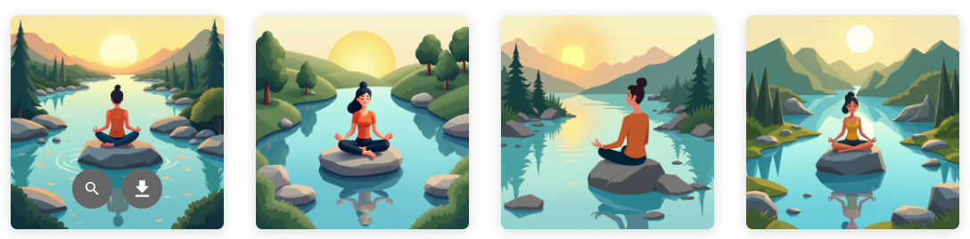 Prefira: “A person sitting in meditation position on a rock in a natural landscape, with a soft sunset reflecting on a calm lake.” (Uma pessoa sentada em posição de meditação sobre uma rocha em um cenário natural, com o pôr do sol refletido em um lago tranquilo).